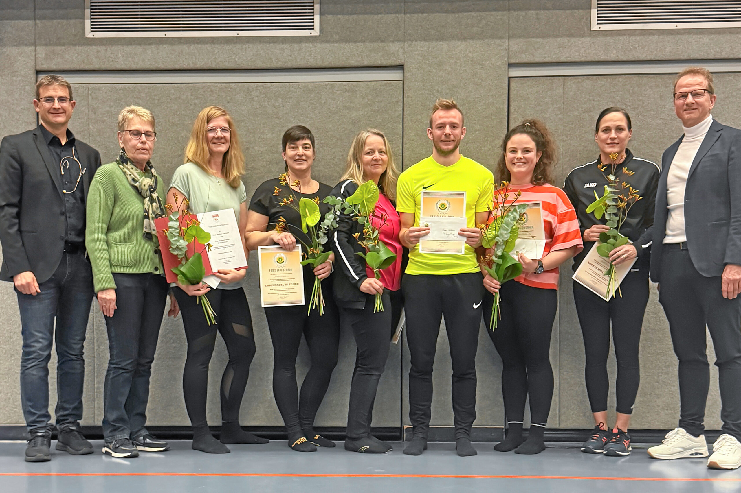 Im Rahmen der Jubiläumsturnschau nutzte der Verein die Gelegenheit, langjährige aktive Mitglieder für ihr ehrenamtliches Engagement zu ehren. Ihre jahrelange Unterstützung im Trainings- und Vereinsbetrieb ist ein wesentlicher Grund dafür, dass der Turnsport in Königheim seit nunmehr sechs Jahrzehnten so erfolgreich und lebendig ist. Geehrt wurden Annette Schreck, Chiara Schäfer, Claudia Feichtinger, Sabrina Schneppelt, Sören Hofmann und Karin Schäfer jeweils mit der Silbernen Ehrennadel des Vereins. Waltraud Grünewald die Vertreterin des Main-Neckar-Turngaus verlieh darüber hinaus Stephanie Stang die Silberne Ehrennadel des Verbandes und hob in ihrer Ansprache insbesondere das ehrenamtliche Engagement im Verein hervor.