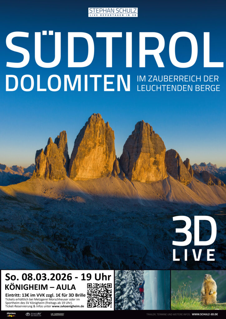 Eine eindrucksvolle Reise durch majestätische Bergwelten, spektakuläre Landschaften und außergewöhnliche Begegnungen erwartet die Besucher am Sonntag, den 08. März 2026, um 19:00 Uhr, in der Aula der Kirchbergschule in Königheim. In einer mitreißenden 3D-Live-Reportagenimmt Stephan Schulz die Besucher mit auf faszinierende Entdeckungen und persönliche Erlebnisse und verleiht der alpinen Bergwelt eine beeindruckende räumliche Tiefe. – JETZT TICKETS SICHERN